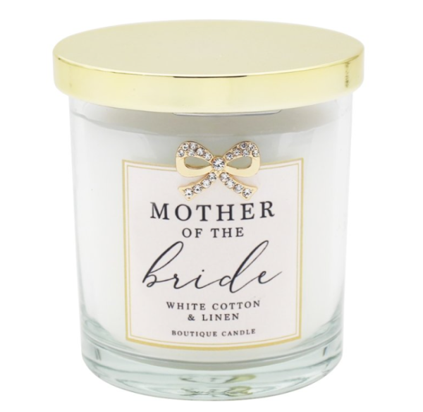 Glass candle jar with gold lid and a diamante bow text ‘Mother of the bride’ white cotton linen scented candle inside individually boxed.